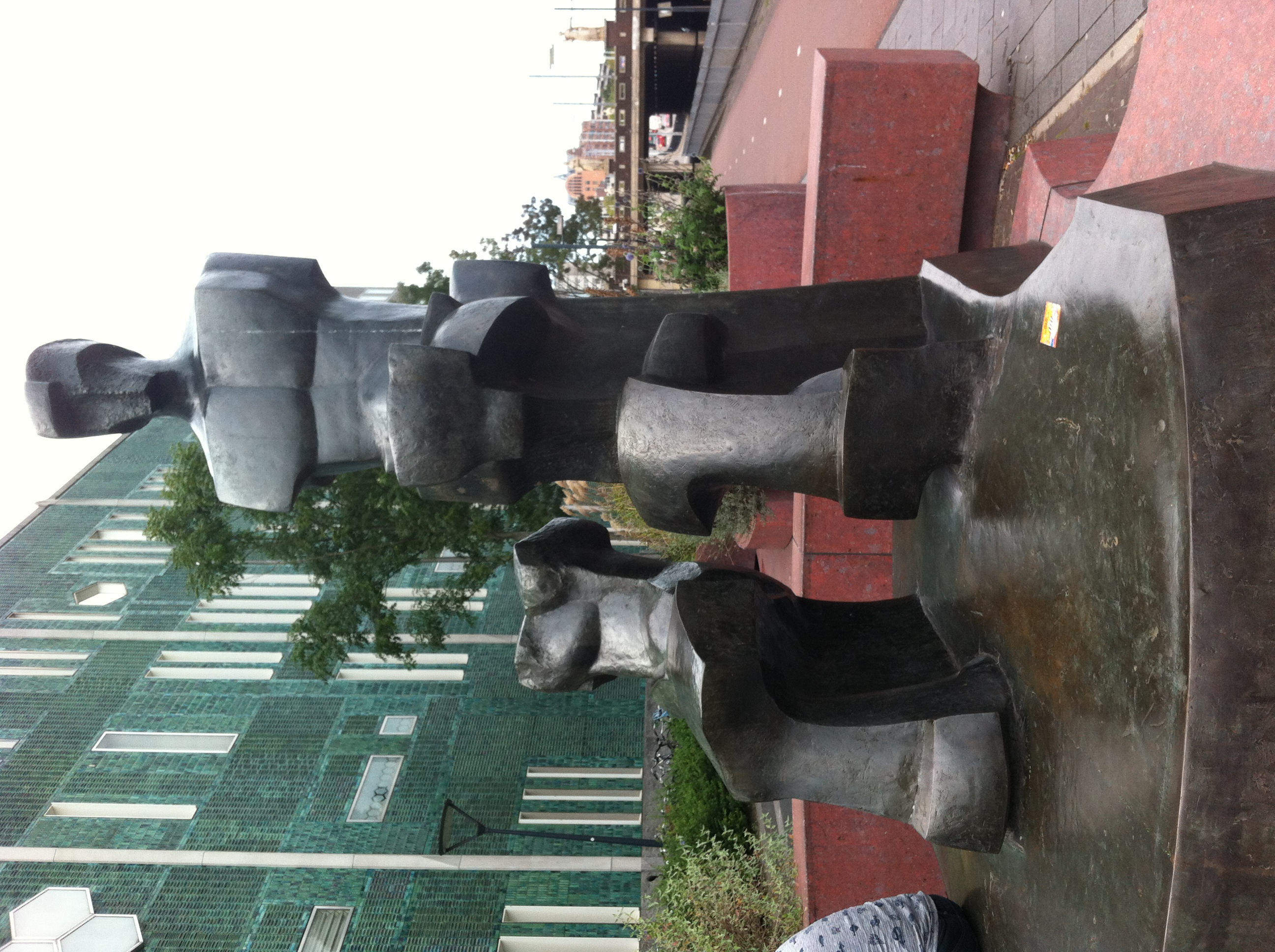 Het blijft intrigeren: de beeldengroep van de Italiaan Mario Negri naast de Bijenkorf in Eindhoven. De stijl van de beelden (postkubistisch en zelfs een tikkeltje futuristisch) is zo in harmonie met de groen geglazuurde gevels van architect Gio Ponti (tevens oprichter van het blad Domus). Wat een allure.