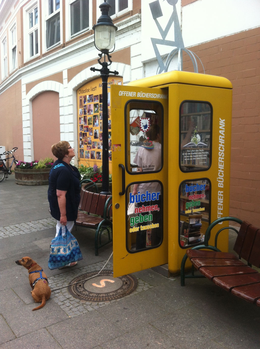 In het centrum van het Duitse stadje Bad Oldesloe liggen de boeken letterlijk op straat. Een in onbruik geraakte telefooncel is ingericht als ‘offener Büchenschrank’; de deur wagenwijd open voor voorbijgangers die boeken (gratis) willen meenemen of ruilen. En de aanwezige collectie stemt niet ongerust: van verrassend oude klassiekers tot beduimelde strips.