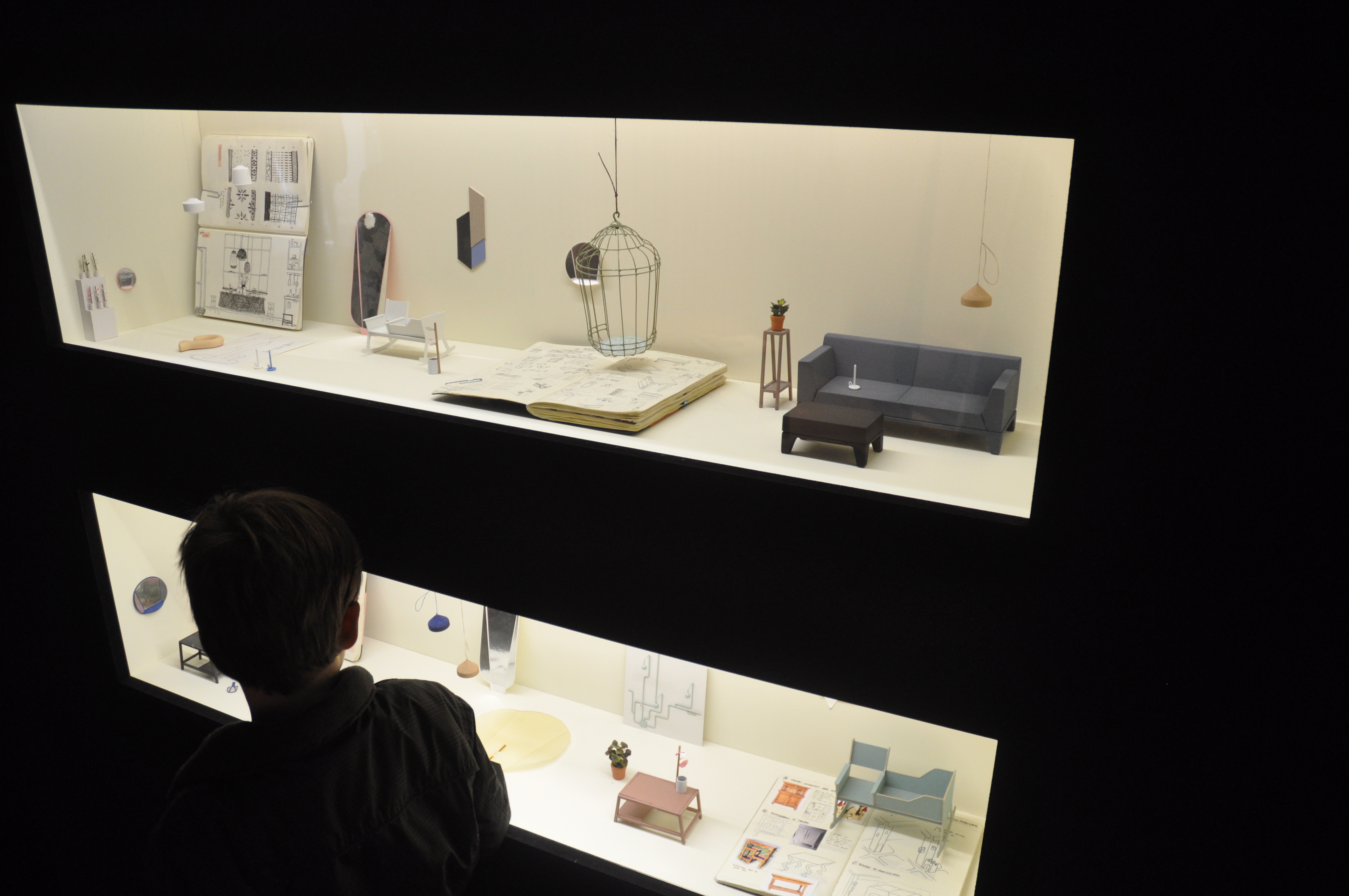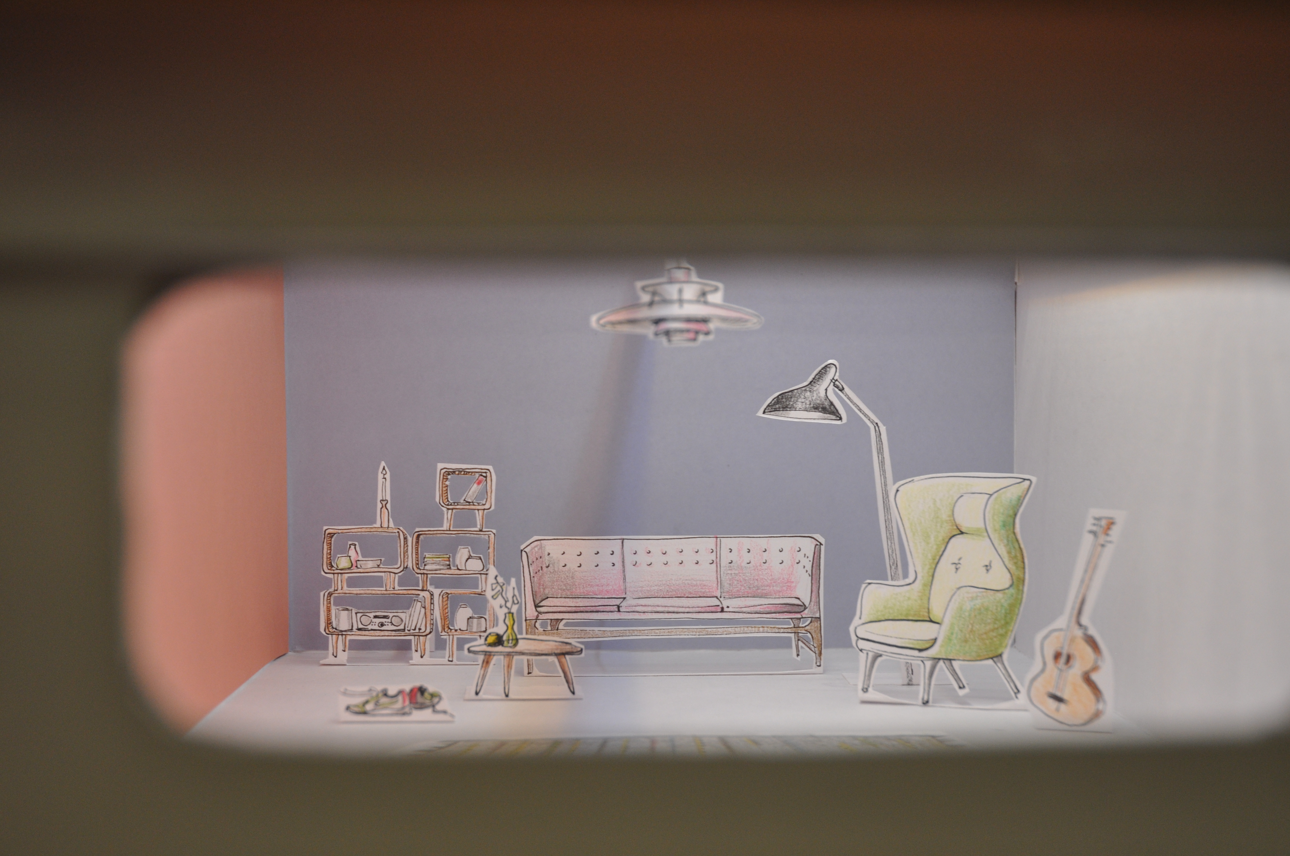 Kijkdoos met getekend miniatuurinterieur door Jetty van Wezel bij Piet Hein Eek