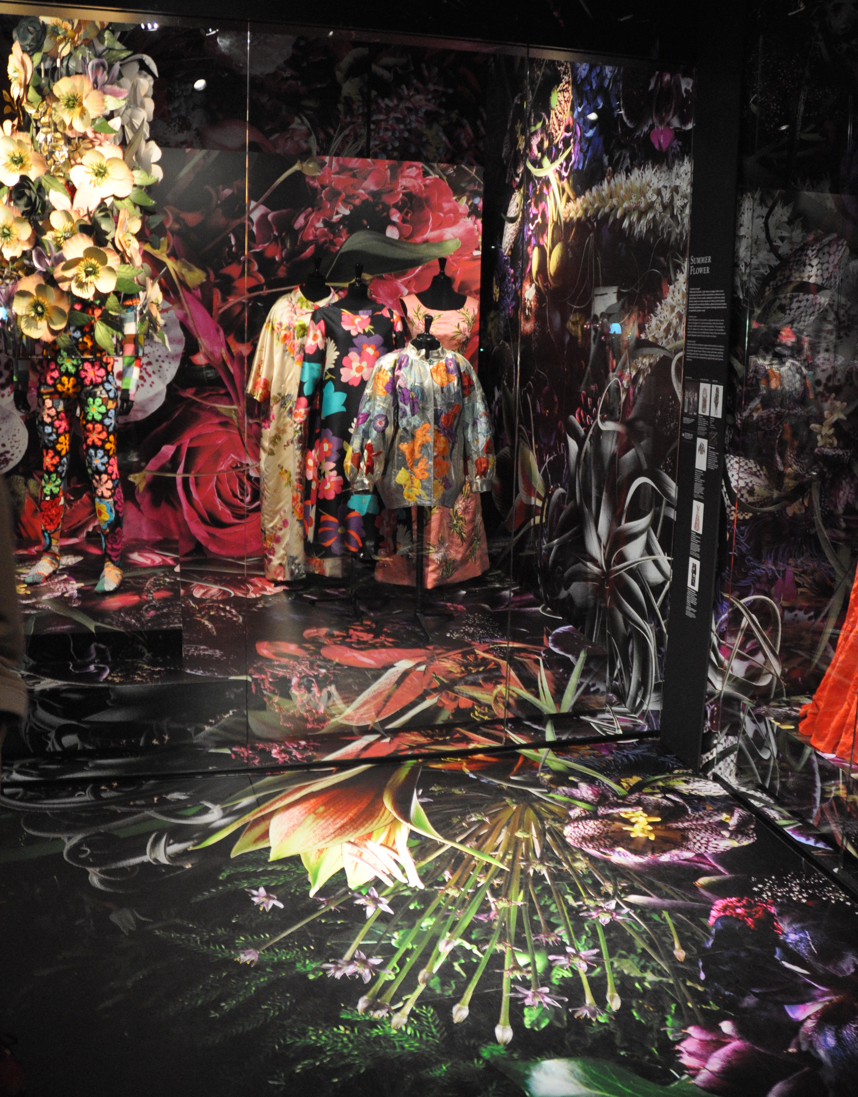 De vitrine met het thema ‘Summerflower’ barst bijna uit z’n voegen van de frivoliteit. Behalve wilde outfits met folkloristische elementen zien we een euforisch beeld van kunstenaar Nick Cave: een figuur dat een torenhoge outfit van reusachtige bloemen draagt. Verder zijn wanden en vloeren uitbundig gedecoreerd met fotografische bloemmotieven naar ontwerp van Makoto Azuma. En dat blijft niet beperkt tot de vitrine, want de bloemen ‘groeien’ gewoon onder het glas door.