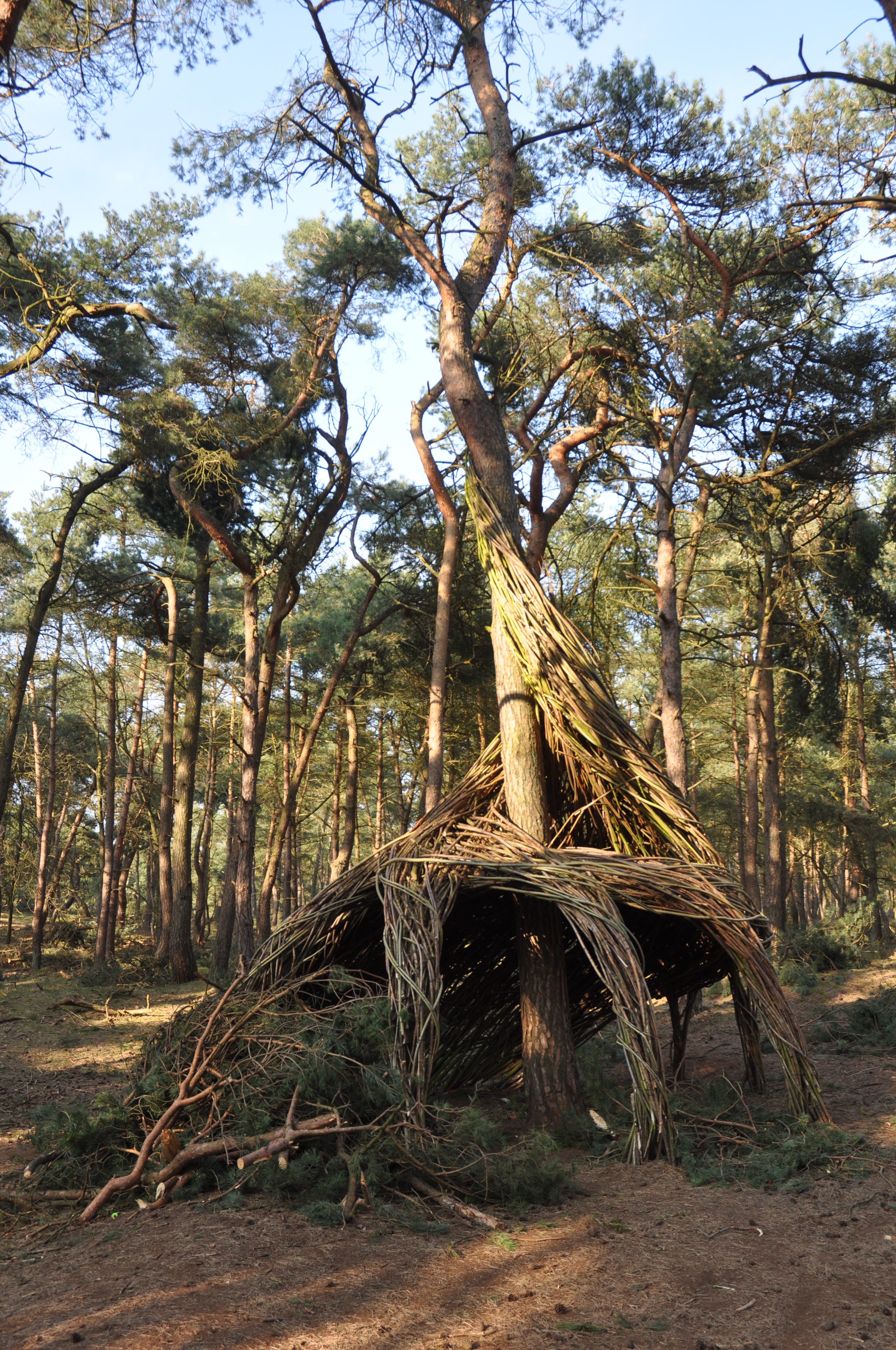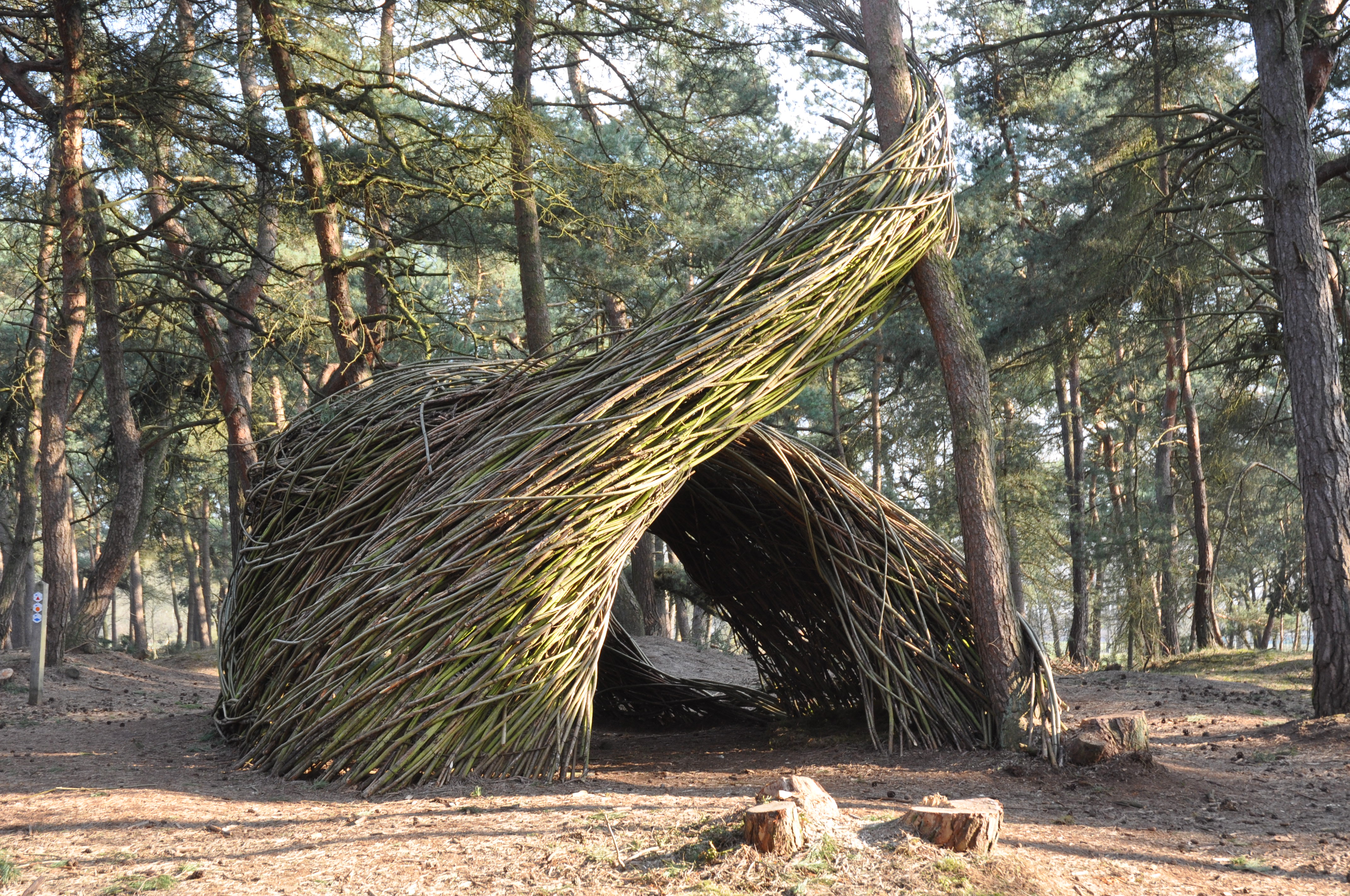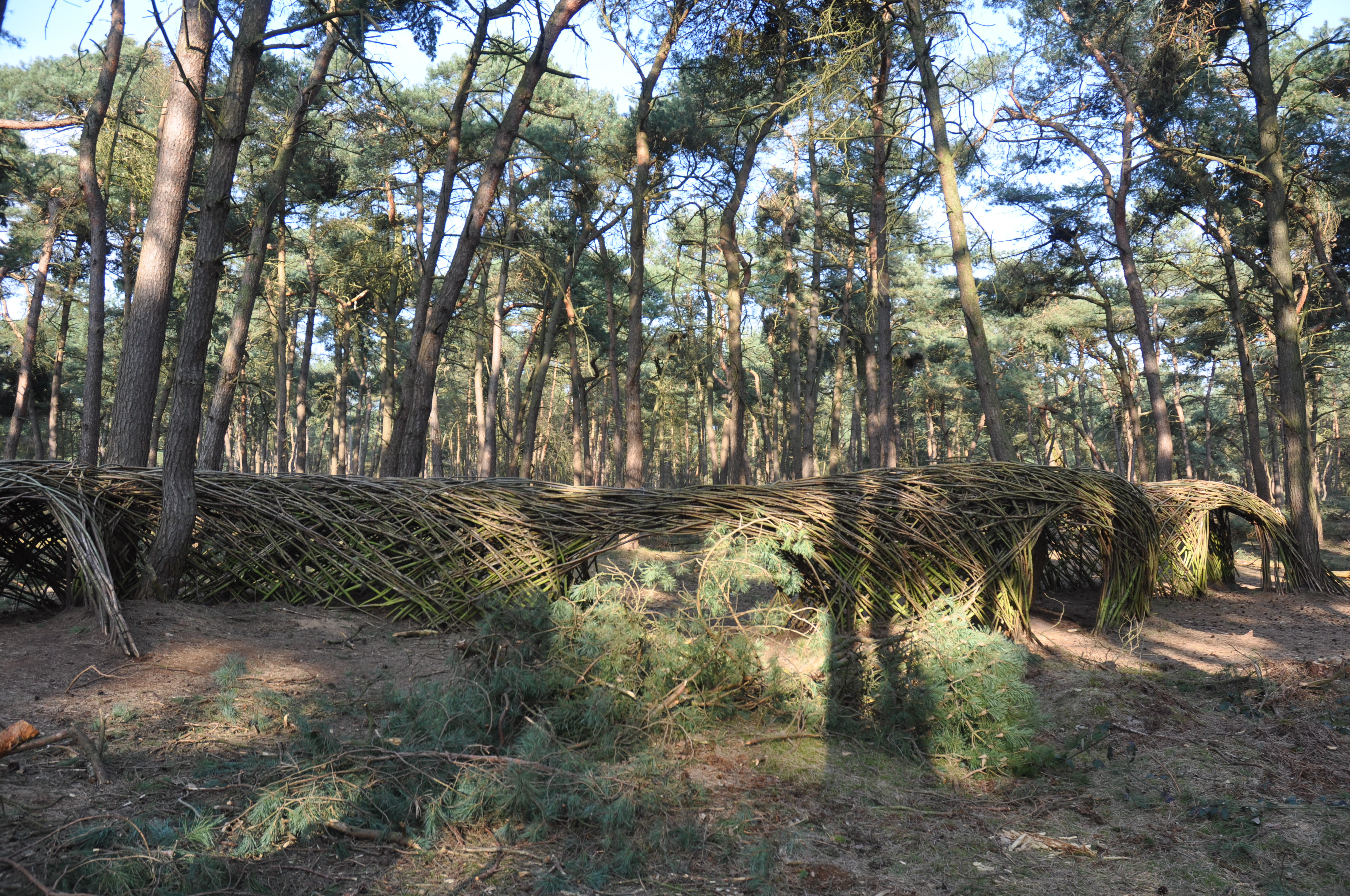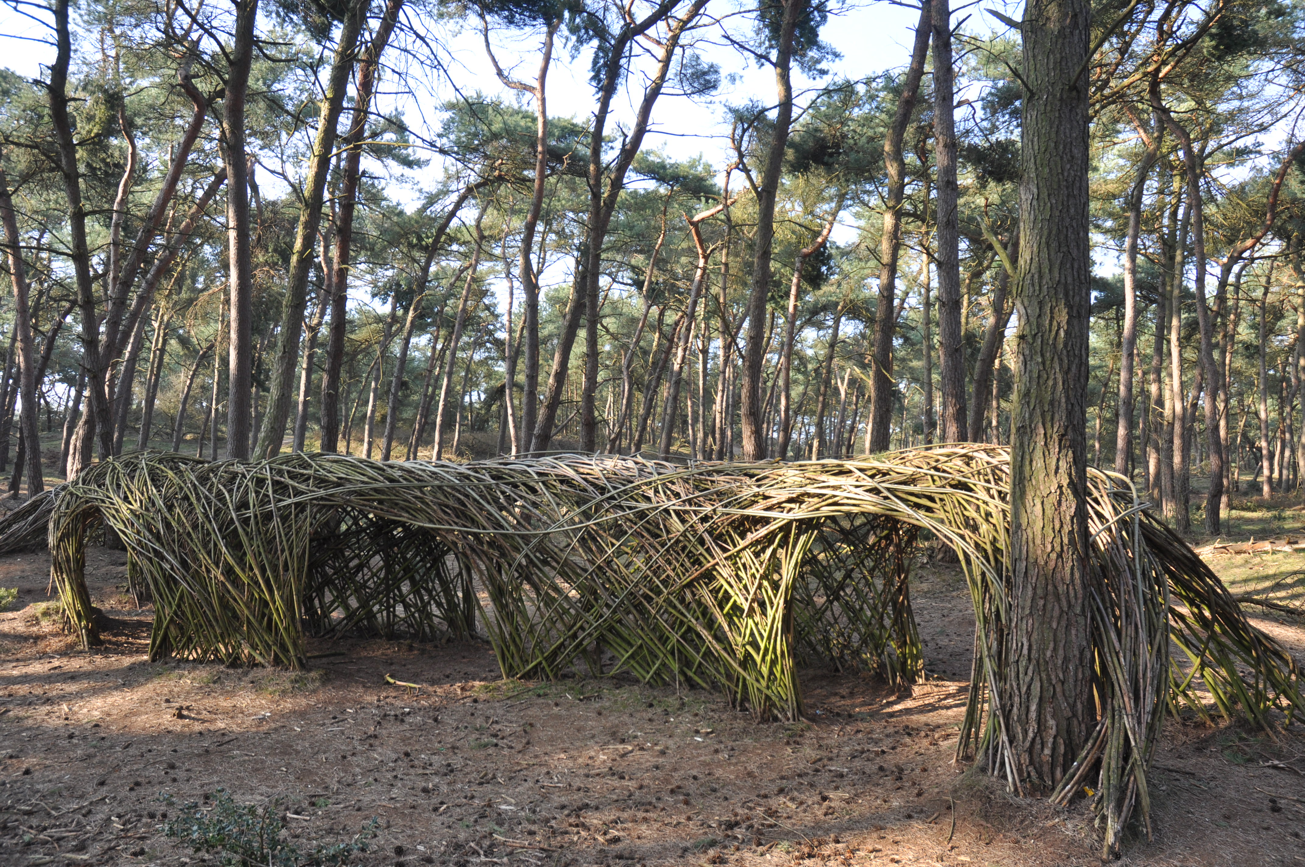 De gevlochten creaties zijn van de hand van kunstenaar Will Beckers, ook bekend als The Willowman. Zijn wilgenspeeltuigen liggen verspreid in een stukje speelbos waar kinderen in alle vrijheid buiten de paden mogen treden. De schuilhutten, tunnels en hangende objecten nodigen uit tot interactie met de natuur! Bio-sculpturen om te ervaren en beleven: ultieme Landart.