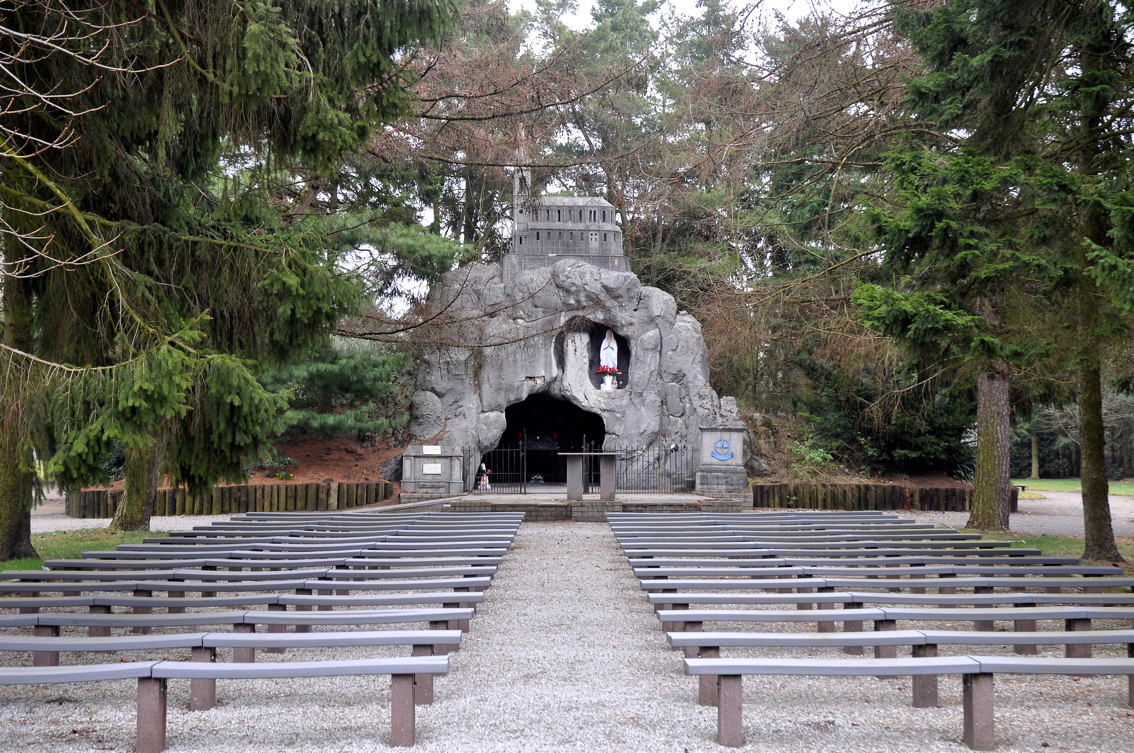De naam Mariapark verwijst naar de imposante Lourdesgrot bij de ingang, waar openluchtmissen voor bedevaartgangers worden opgevoerd. Boven op de grot torent een statig schaalmodel van de kathedraal uit Lourdes met echte vensters. Gebeden worden hier gehoord, getuige de genezing uit 1932.