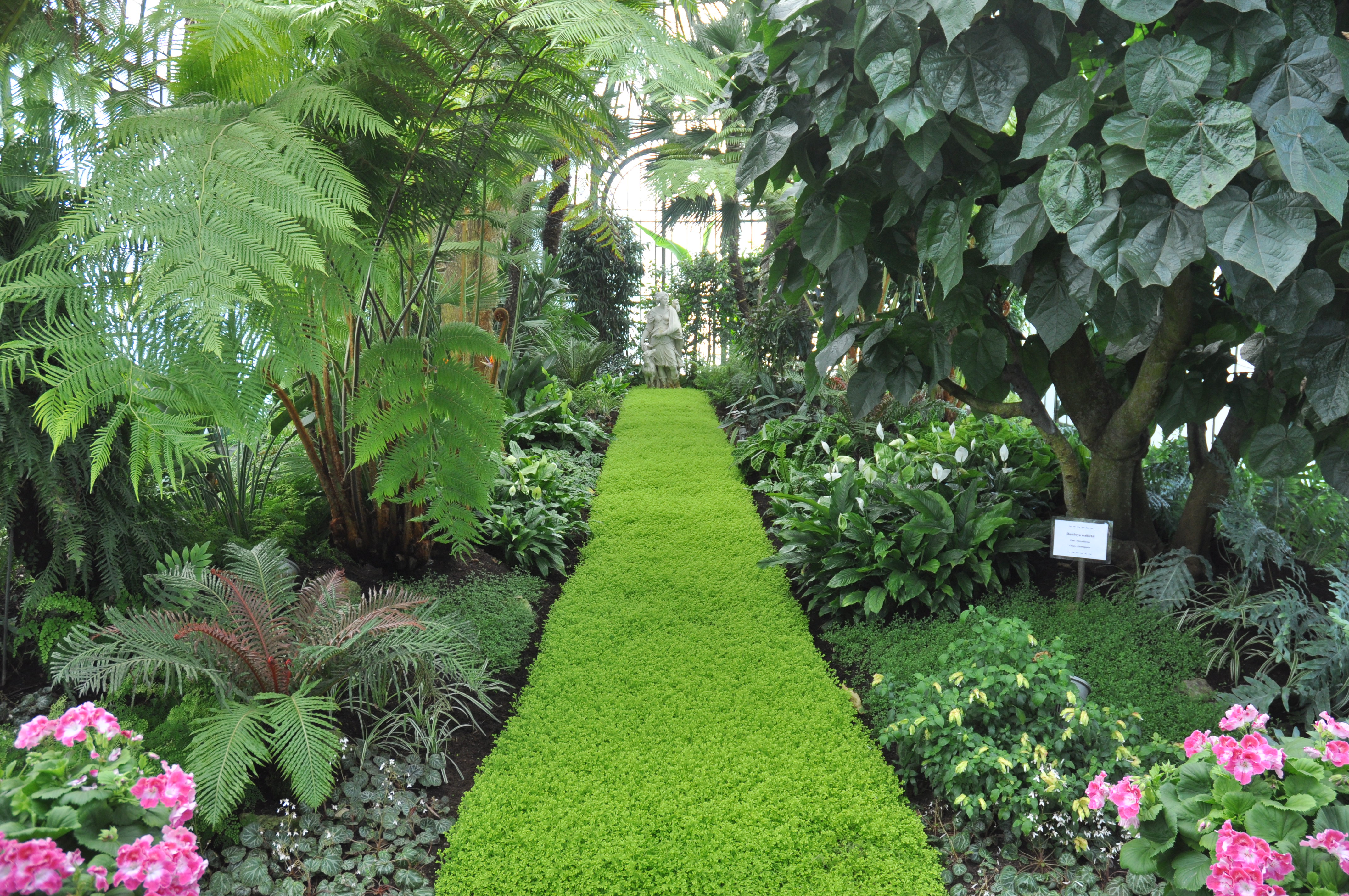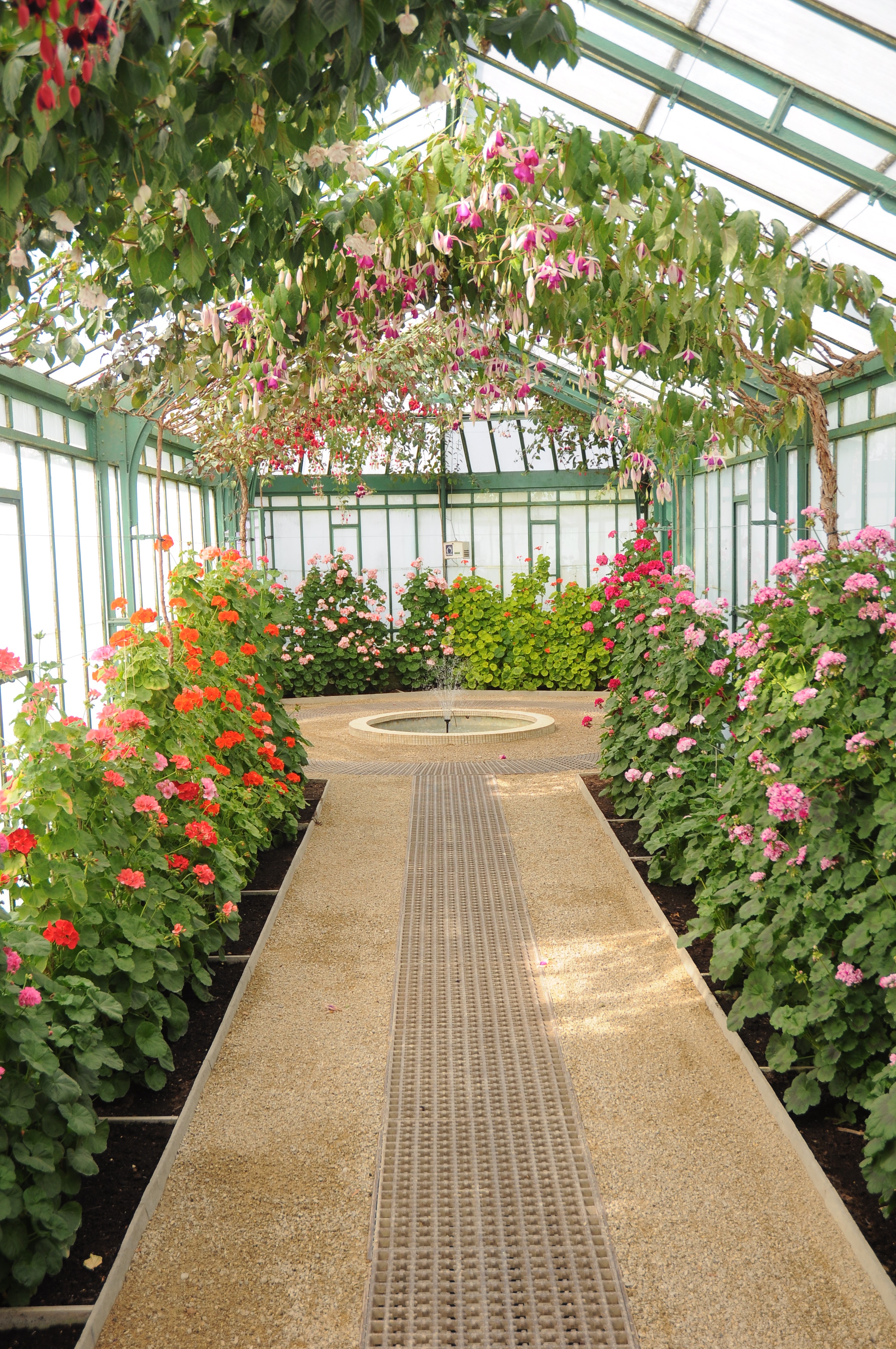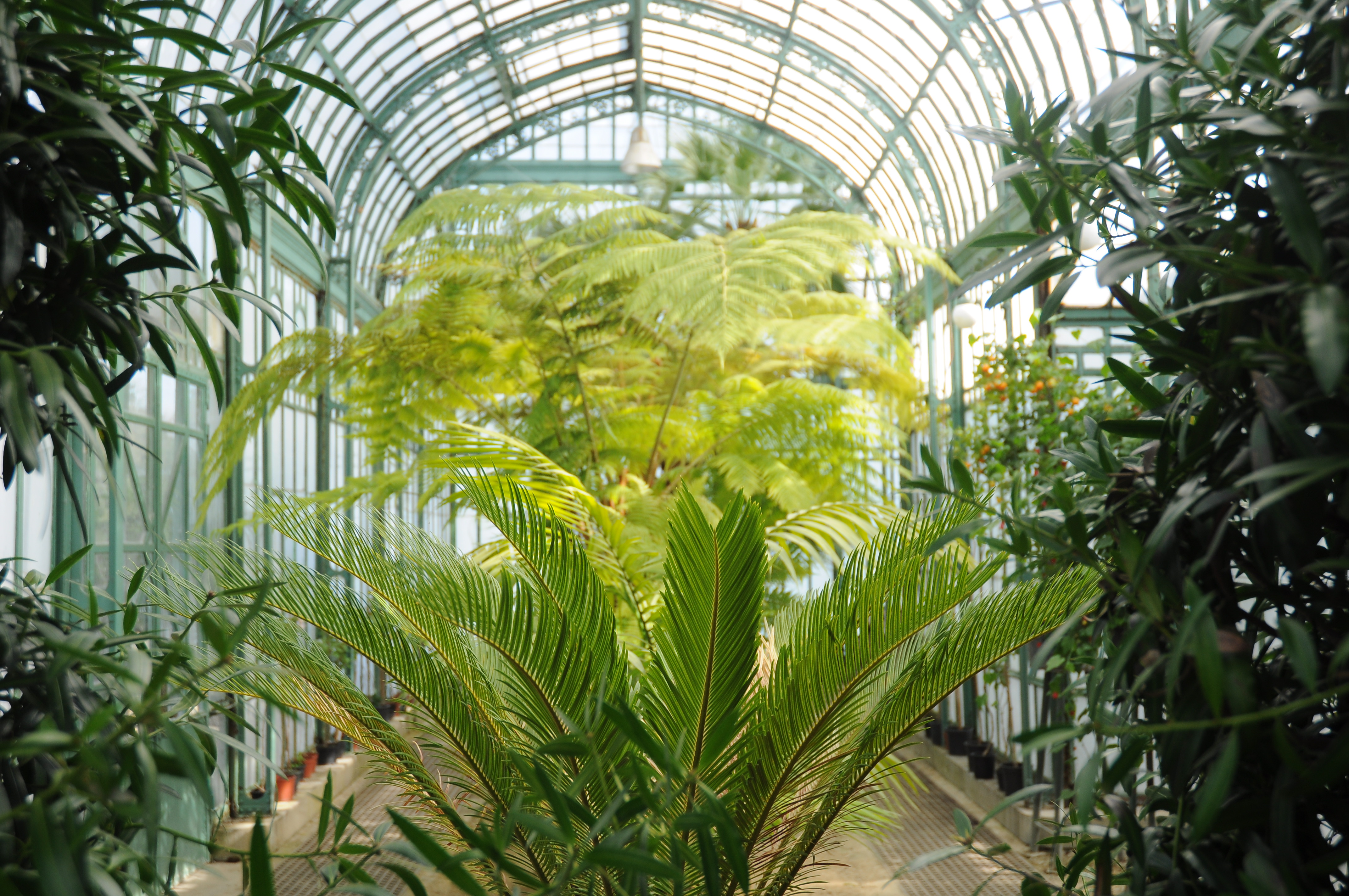 Vanaf de erehekken geeft een honderd meter lange Orangerie – inderdaad met sinaasappelbomen – toegang tot de serres. Via een netwerk van beglaasde gaanderijen en (deels ondergrondse) trappenstelsels zijn diverse paviljoens te bereiken. Het regenboogglas laat de kassen schitteren als zeepbellen of parels in de zon. Elders is het glas wit gekalkt tegen direct zonlicht. Onderweg kun je je verwonderen over uitzonderlijke varens, palmen, mossen en rubberplanten, of opgaan in de kleurenrijkdom van uitbundig bloeiende camelia’s, hortensia’s, geraniums en fuchsia’s.