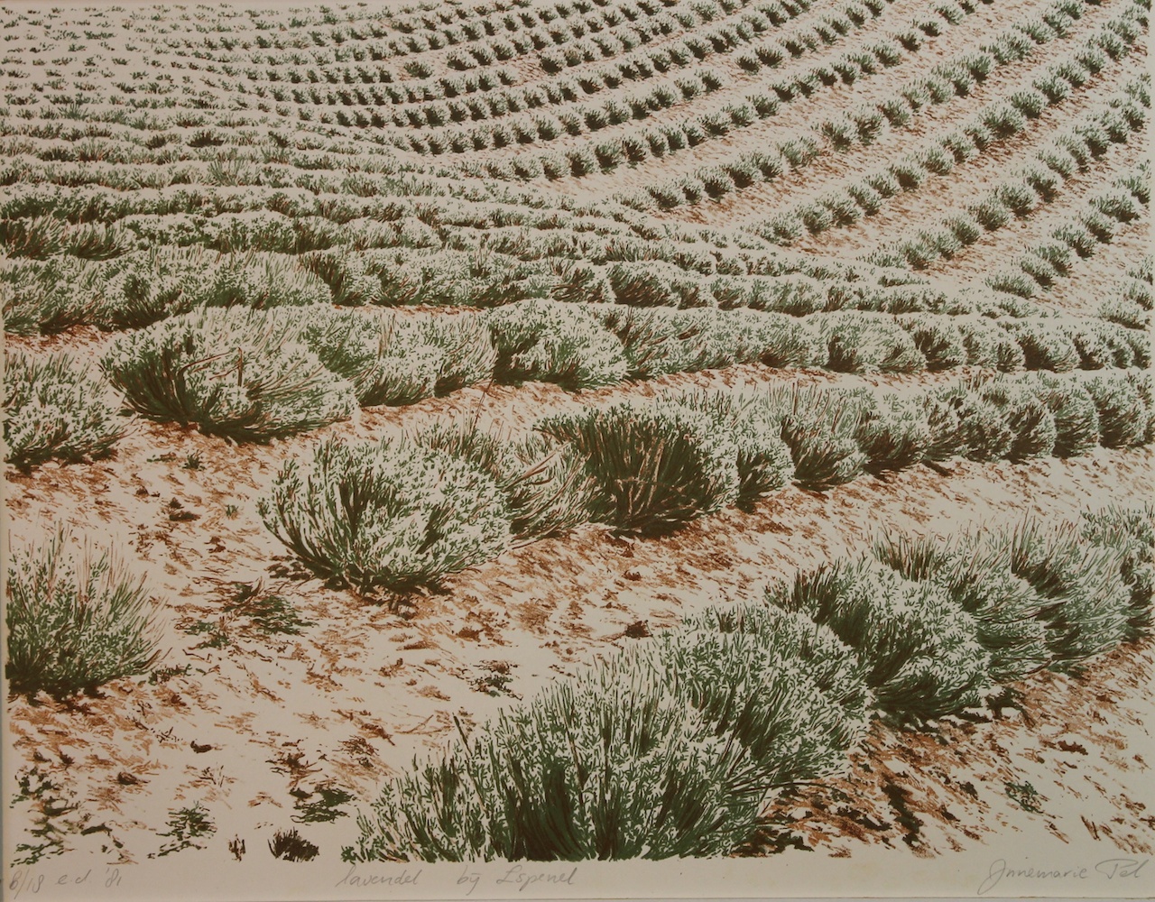 ⇧ Wie ooit de Drôme heeft bezocht, zal de landelijke sfeer van ‘Lavendel bij Espenel’ herkennen. Prachtig hoe de lavendelstruiken in lange rijen over de Franse heuvels golven. Nog wat zon en ze schieten in bloei. Een stemmig werk in groen en bruin gemaakt door Annemarie Pel, die met een grafische tekenhand schitterend de seizoenen en weersomstandigheden weet vast te leggen. Trouwens de laatste litho die nog uit deze oplage beschikbaar is!