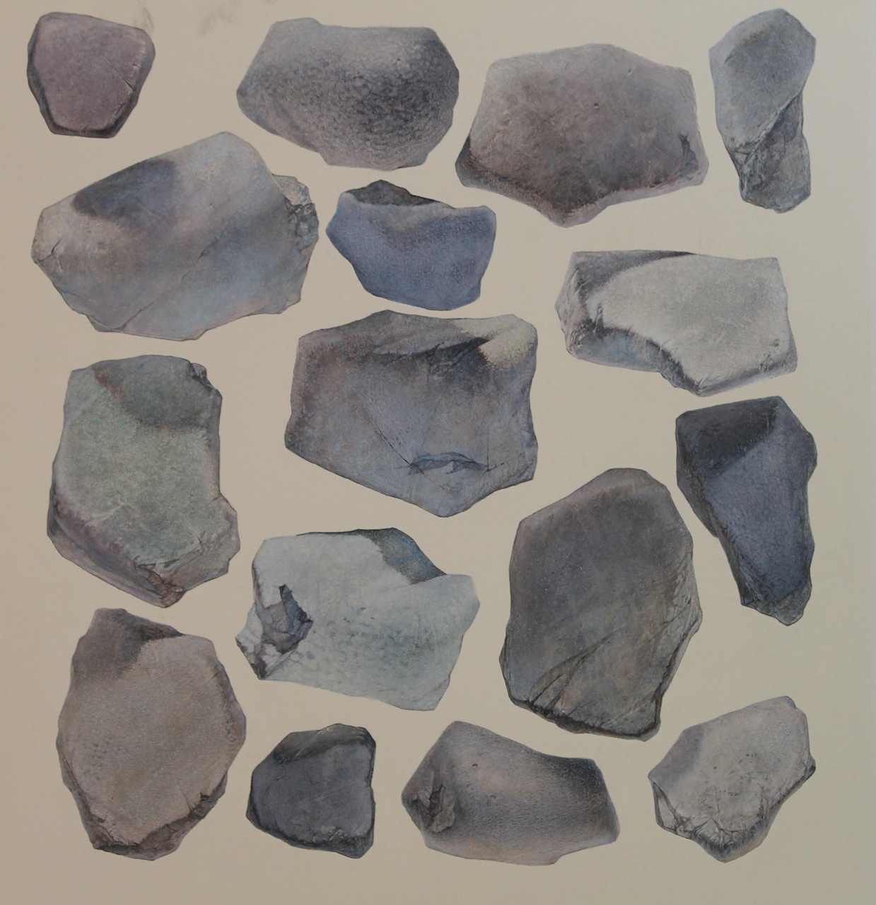 ⇧ Deze realistische potlood- en pastelkrijttekening is werkelijk een juweeltje. ‘Rechthoek van Steen’ toont een verzameling stenen die samen tot een strakke rechthoek zijn geordend. Door de scherpe outline van de stenen en de effen achtergrond lijkt het een wetenschappelijke weergave van een archeologische opgraving of geologische expeditie. Details zoals barstjes, scheuren, inkepingen, aders, rondingen, hoeken en krassen zijn zo realistisch en nauwgezet uitgewerkt! Hoe subtiel is ook dat kleurgebruik van iedere afzonderlijke steen.