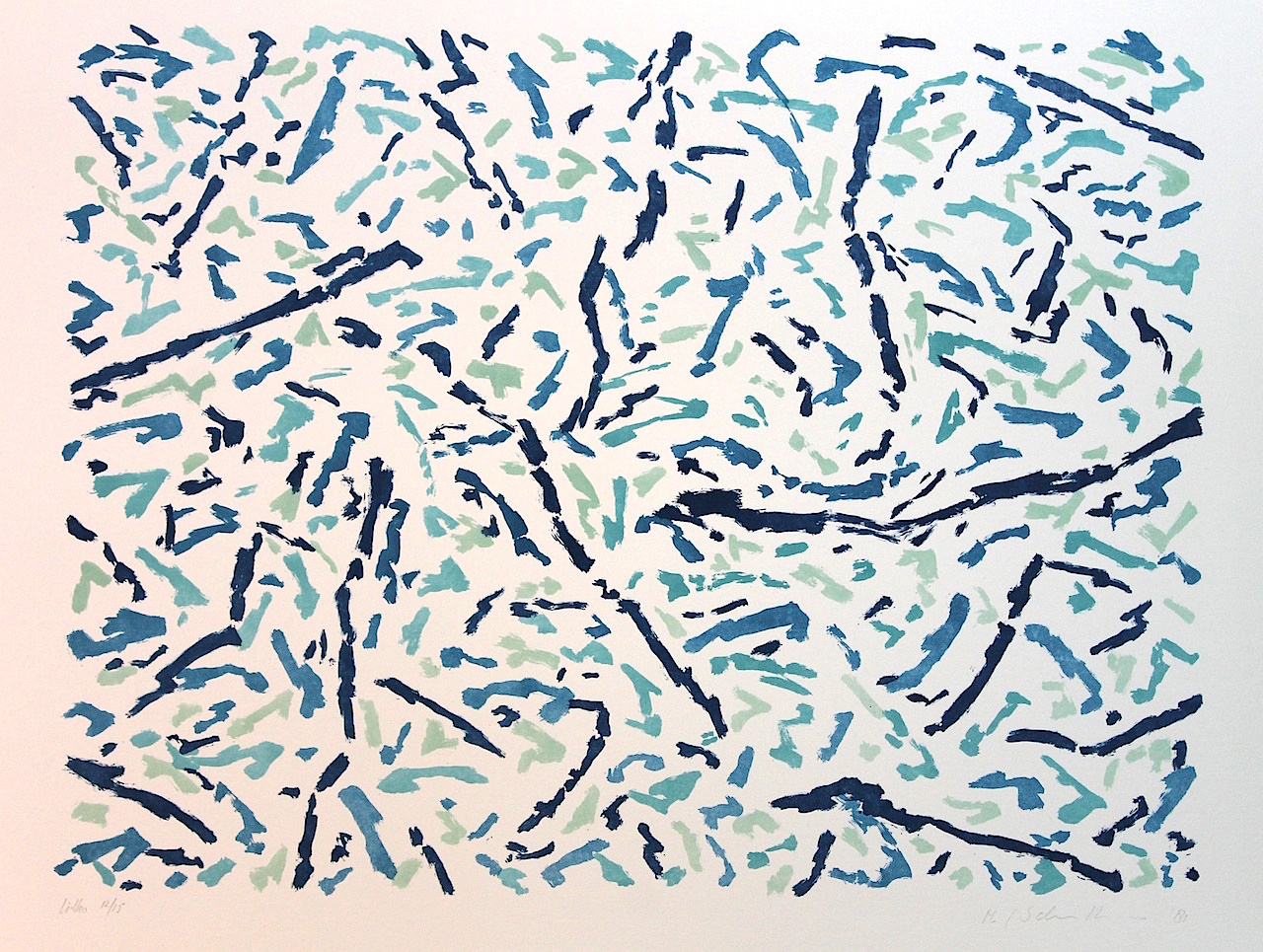 ⇧ Is het een abstract weergegeven bladerdek van een boom, of de rimpelingen van kabbelend water? Zelfs zonder direct herkenbare voorstelling is deze litho van Marian Schutte uiterst boeiend. Dynamische ‘crinkles’ in groen en blauw krioelen organisch over het vlak en zorgen voor een fris camouflagepatroon.