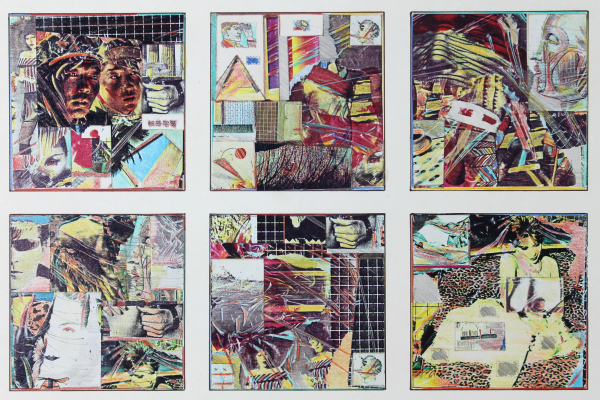 ⇧ Deze bonte collage van kunstenaar David Flipse swingt zowat uit zijn kader. Met fotofragmenten en gekleurd potlood schept Flipse een enerverend multiculti-tafereel. Flipse studeerde in de jaren ’70 aan het San Francisco Art Institute en werkte daarna afwisselend in Rotterdam en San Francisco. In deze collage mixt hij Pop-Art elementen (zie de herhaling van beeldelementen) en exotische motieven (luipaardvellen en Afrikaanse krijgers) tot een Rapper’s Delight.