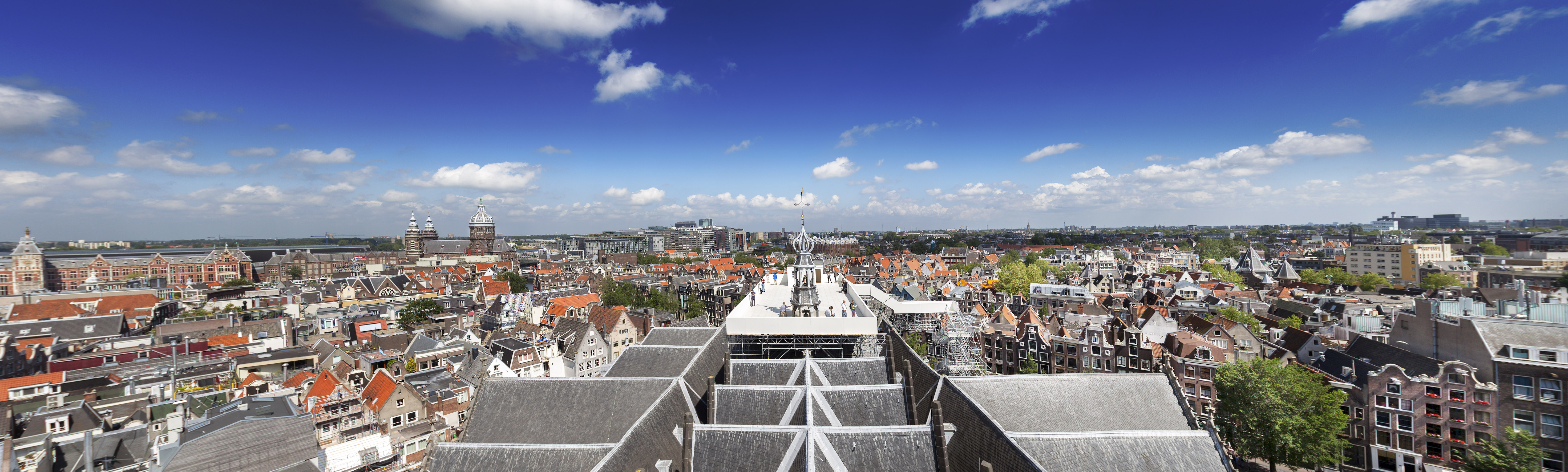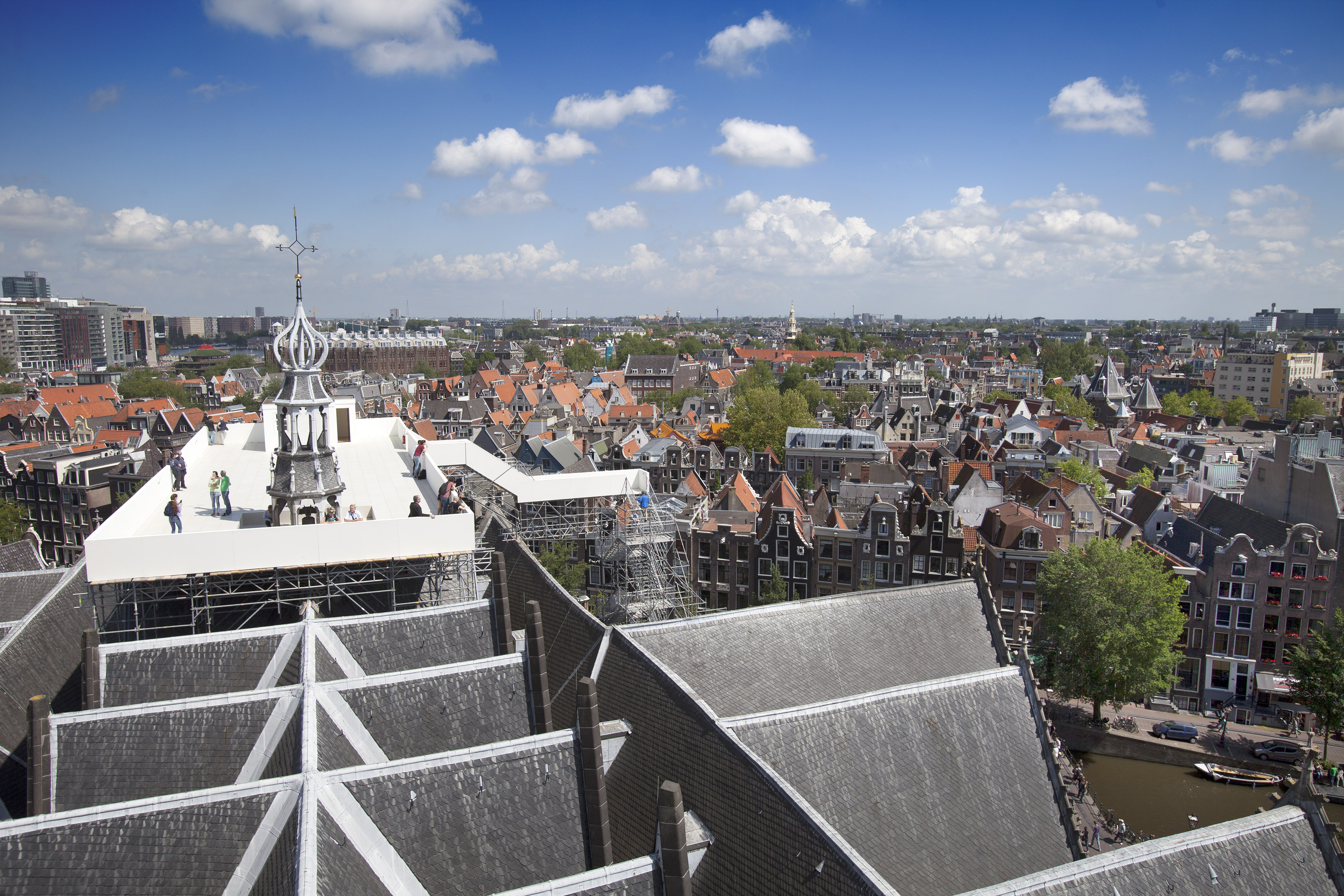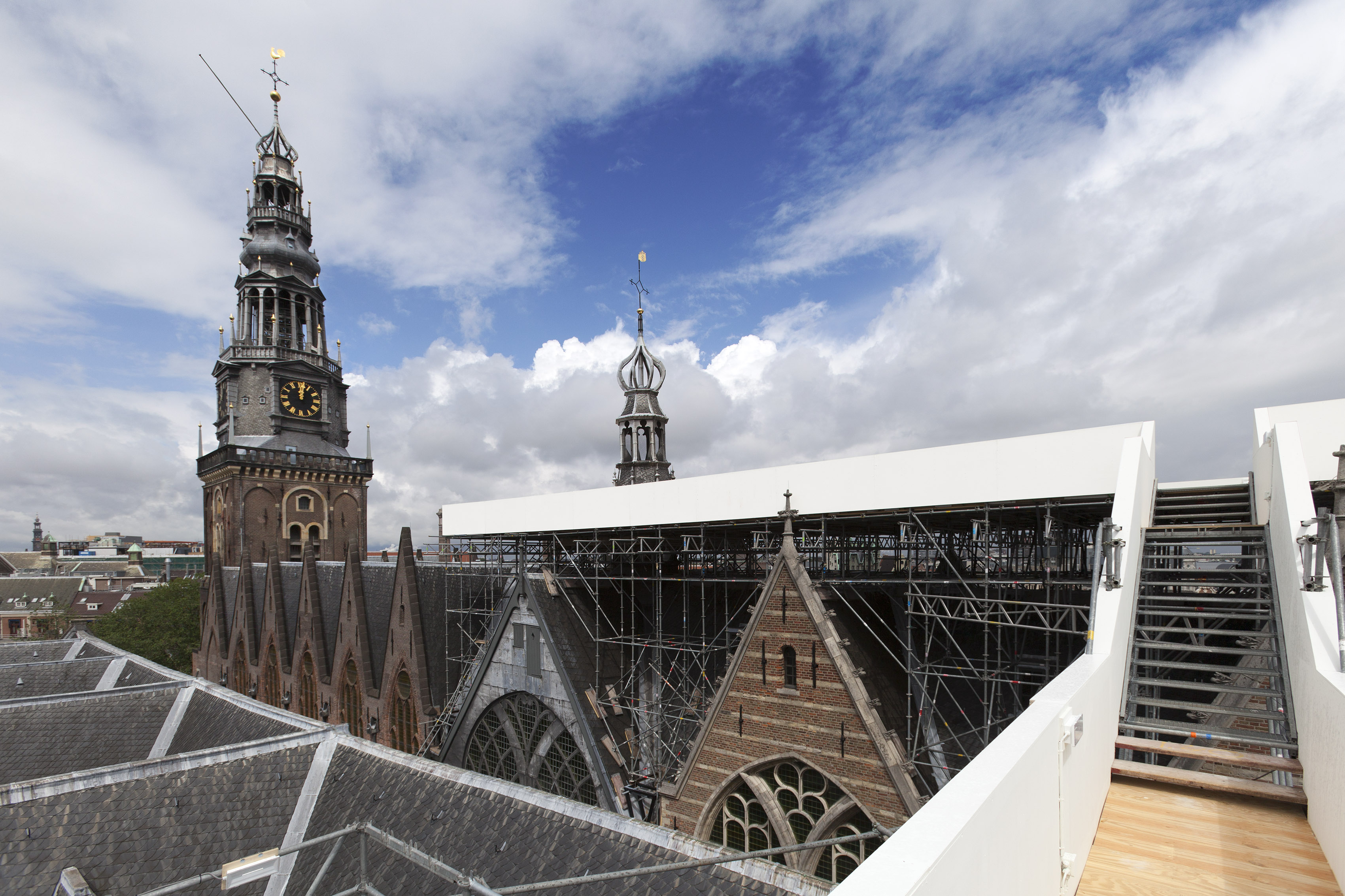 Zo ook in Amsterdam. Op het spierwitte observatieplatform boven de Oude Kerk ervaar je de kerk en de stad zoals je deze nog nooit hebt gezien. De skyline is indrukwekkend met Hollandse wolkenluchten en herkenbare architectuuriconen zoals de Beurs van Berlage, Het Centraal Station, de Rembrandtoren, het Tropen- en Scheepvaartmuseum. Om er te komen moet je de trappen van een steiger constructie aan de buitenzijde van de kerk beklimmen. De ruwe constructie is door Atzu bewust in het zicht gelaten om de sensatie te bekrachtigen. De fysieke inspanning van de klim naar boven helpt je los te komen van de alledaagse realiteit. Zeker als je sterke gevoelens van hoogtevrees moet onderdrukken 😉