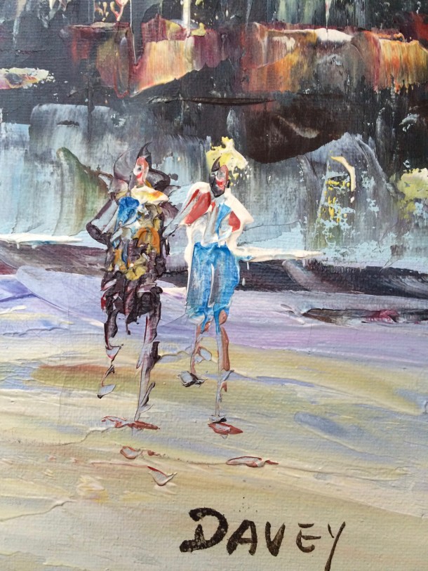 Je begrijpt dat ik de kringloopwinkel mét schilderij heb verlaten, ook al vond ik de wit aluminium lijst die er omheen zat niet mooi. Googlend op het signatuur ‘Davey’ kreeg ik een aantal hits bij veiling- en verkoopsites als eBay, Artnet en Artbrokerage. En kijk eens aan, de stijl is hetzelfde en de voorstellingen lijken op elkaar. Ik heb wat voorbeelden op een rij gezet.