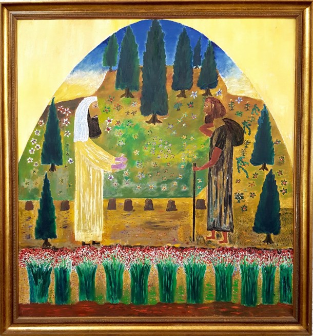 “Het was een besloten kamertje, verstild. Er was geen direct contact met de wereld. Hier ontstonden zijn fantasieën van de gebeurtenissen in het Heilige Land. (…) De geluiden bestonden uit het schrapen van potlood, tube (…) of penseel over het linnen, het zachte fluiten en af en toe een scheepshoorn of een dieselmotor in de verte op de rivier. Terugdenkend komen de beelden, geuren en geluiden weer terug. Een intens gevoel van warmte vervult me.”