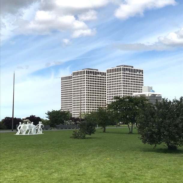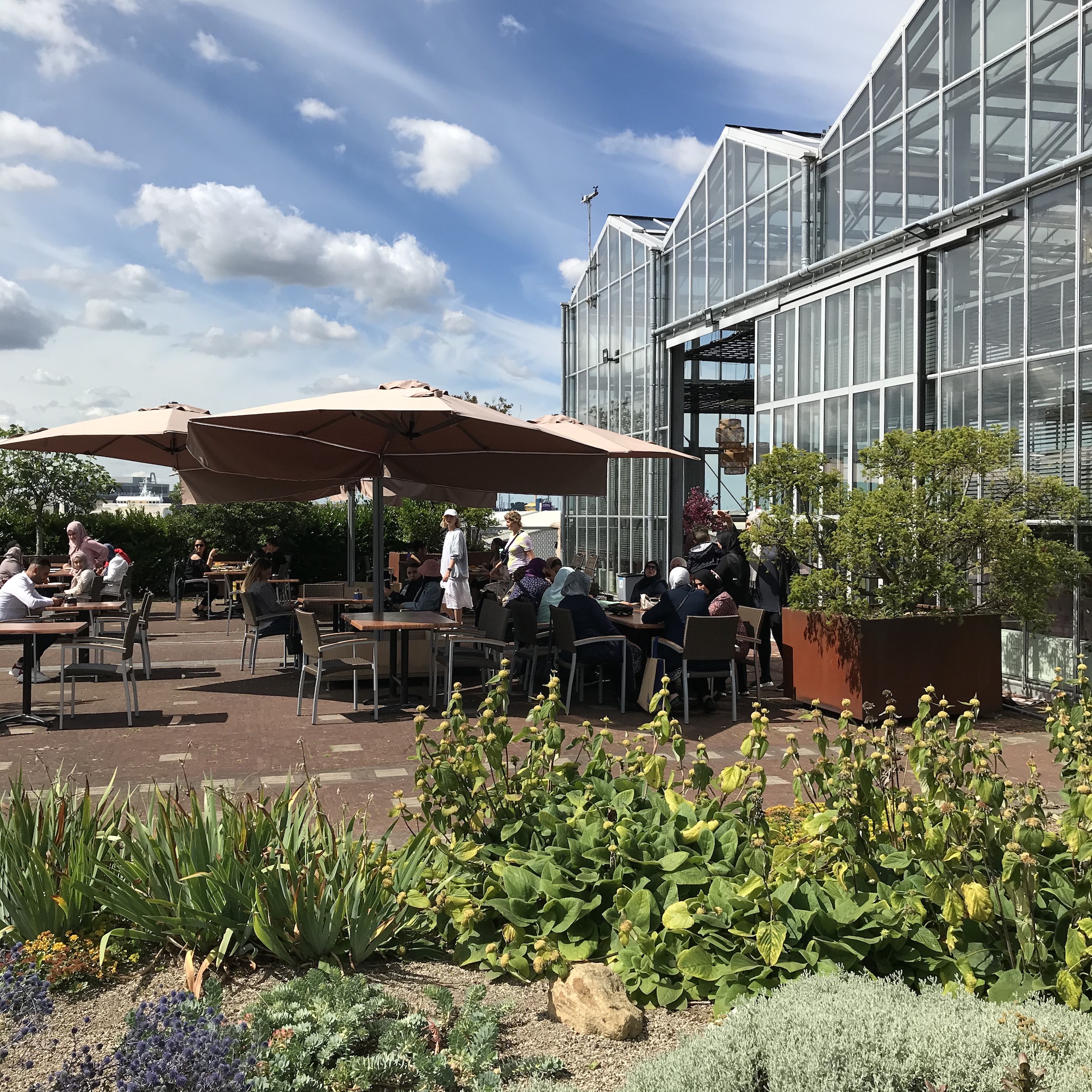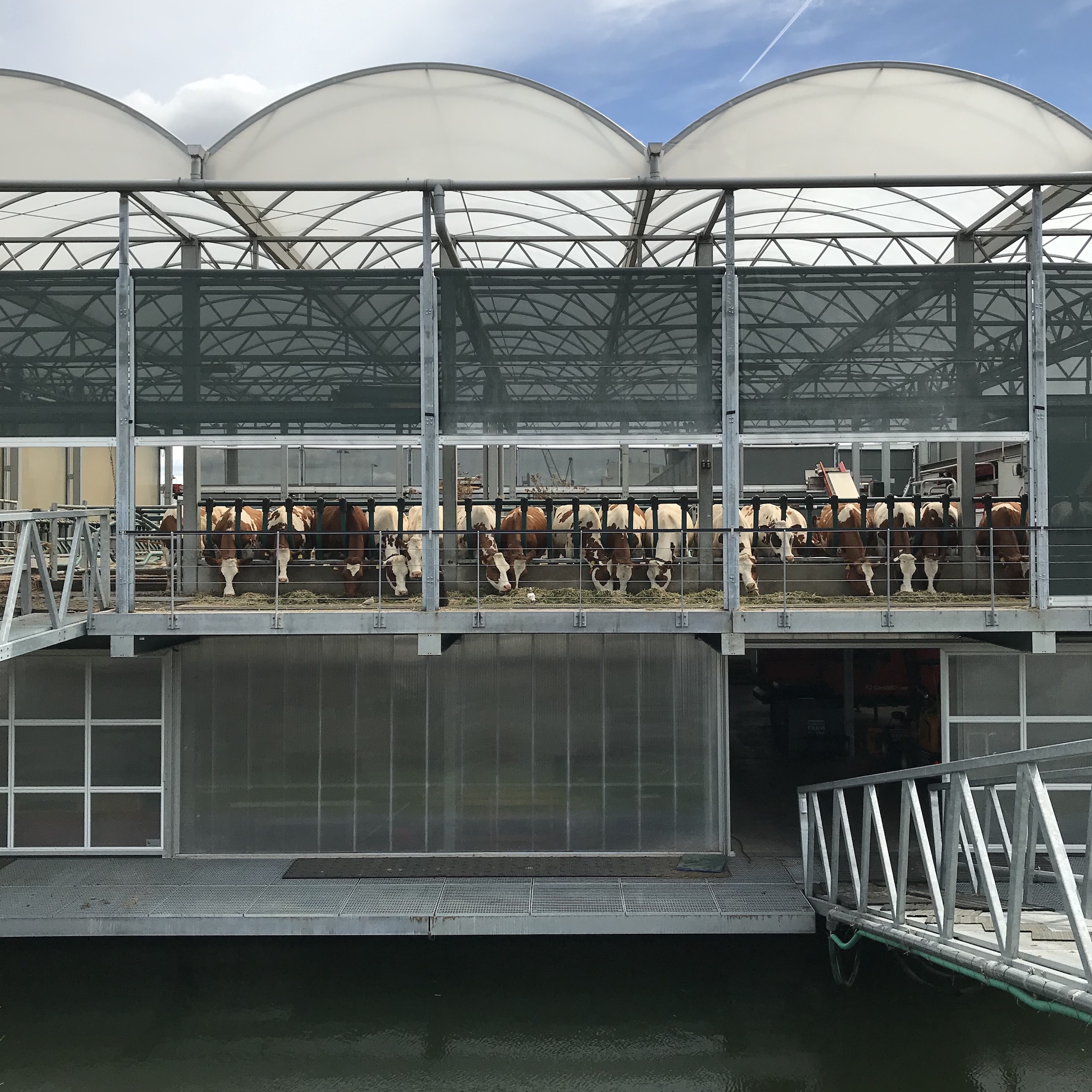 Vanaf Weelde kun je een watertaxi naar het centrum nemen, maar de volhouder loopt door naar de Floating Farm waar twee cor-ten stalen beelden van AVL staan. Je weet even niet wat je ziet: een melkstation met koeien en zonnepanelencentrale dobberend op het water! Een loopbrug verbindt de geheel zelfvoorzienende unit met de uitloopweide op de kade, zonder tussenkomst van mensen. Doeltreffend of juist dieronvriendelijk, daar kun je over twijfelen, maadorstlessend is het hier gekochte flesje verse karnemelk zonder twijfel. Let’s Get Physical smaakt naar meer….